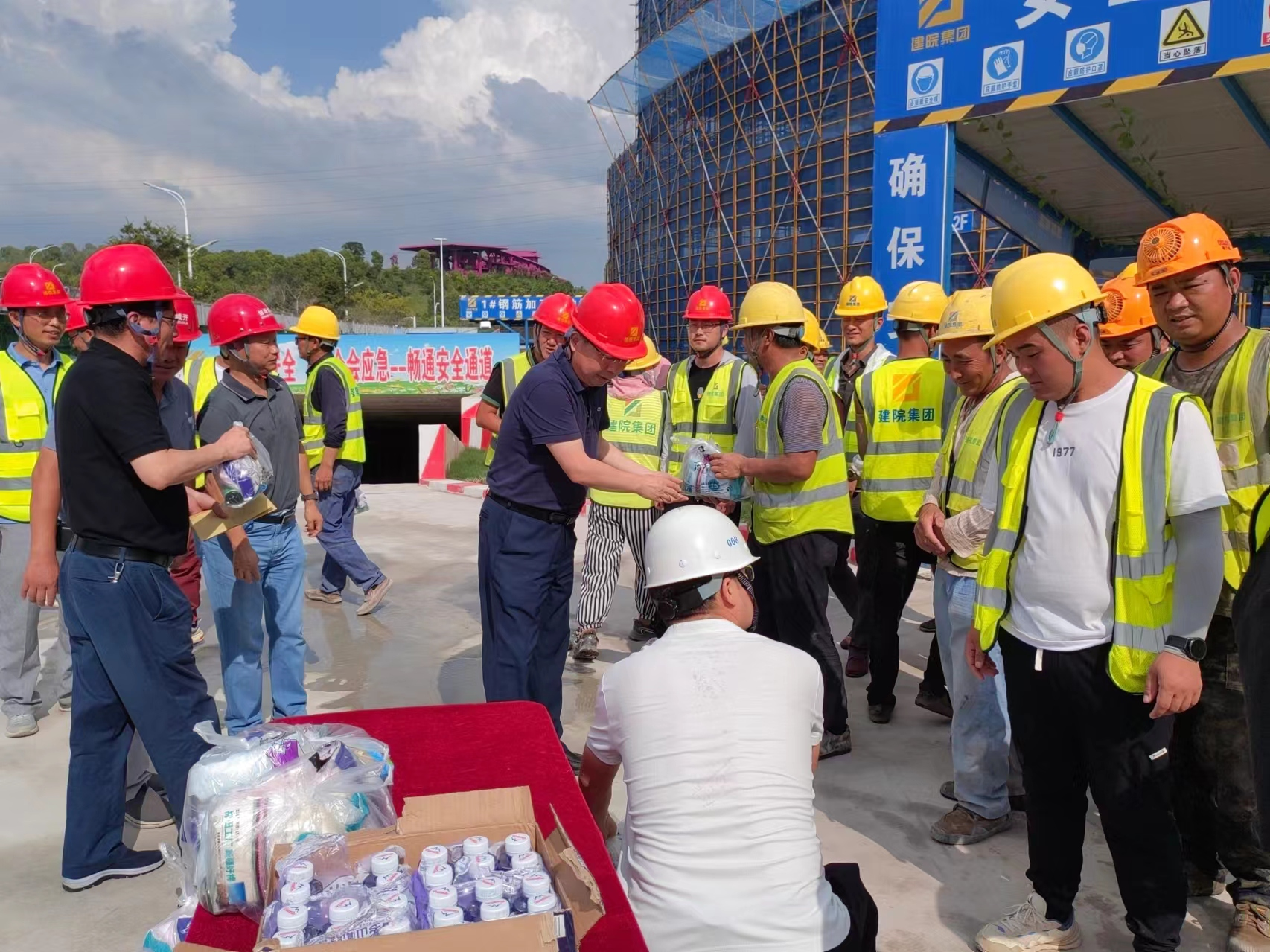 炎炎夏日送清涼,絲絲關懷暖人心。持續高溫悶熱天氣,給堅守一線的職工帶來了嚴峻“烤”驗。為切實做好抗高溫防暑降溫工作,有效防控高溫中暑事件和安全生產事故的發生,切實維護廣大職工的勞動安全和健康權益,按照市國控集團黨委、市國控集團工會的統一部署,7月25日-7月26日,集團黨委書記、董事長陳建功,黨委副書記、副董事長、總經理劉冰,黨委委員、副總經理翁暢等分別帶隊走訪慰問了建筑科創中心項目部、新二中站點、幸福河湖項目部、馬城糧庫,為堅守在一線的項目員工送上毛巾、香皂、清涼油等慰問品,對大家的辛苦付出表示感謝,對一線職工不畏高溫、堅守崗位、拼搏奉獻的精神表示贊揚,同時叮囑大家要努力克服高溫天氣帶來的困難和挑戰,注意防暑降溫,做好自身防護,確保各項工作安全有序推進。